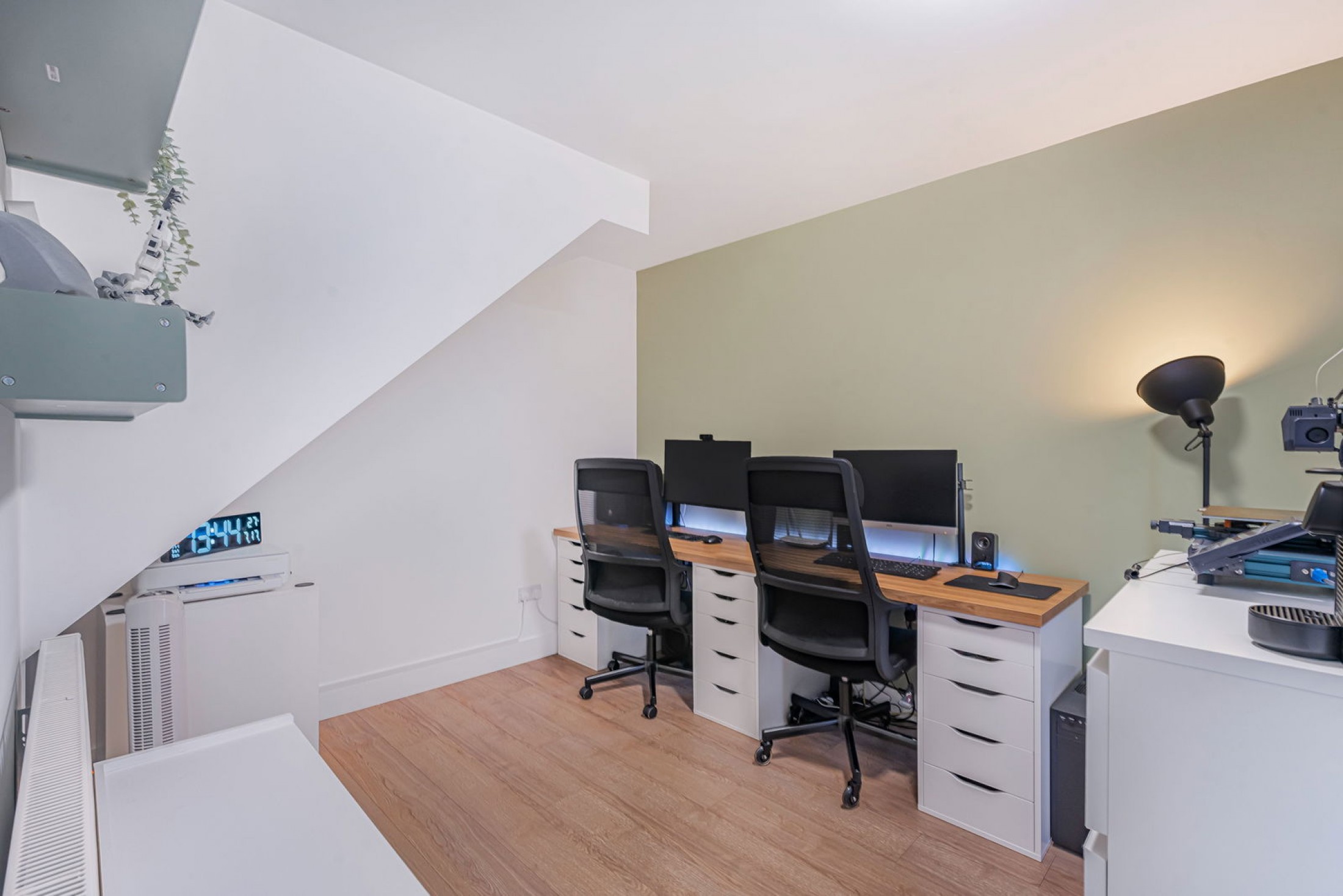 The present owners have substantially modernised the property since purchasing including new windows and doors, heating system, bathroom and total redecoration throughout. Further benefitting from gas central heating and double glazed windows the accommodation comprises as follows; to the ground floor, private entrance leading to a spacious hallway, family bathroom, second bedroom and garage/home office. The second floor provides a large lounge area, modern fitted kitchen and further double bedroom. Views to the rear overlook the impressive communal grounds with its central pond providing an impressive outlook. Externally the front driveway provides parking for one car, with further parking available via a permit and access to the garage.